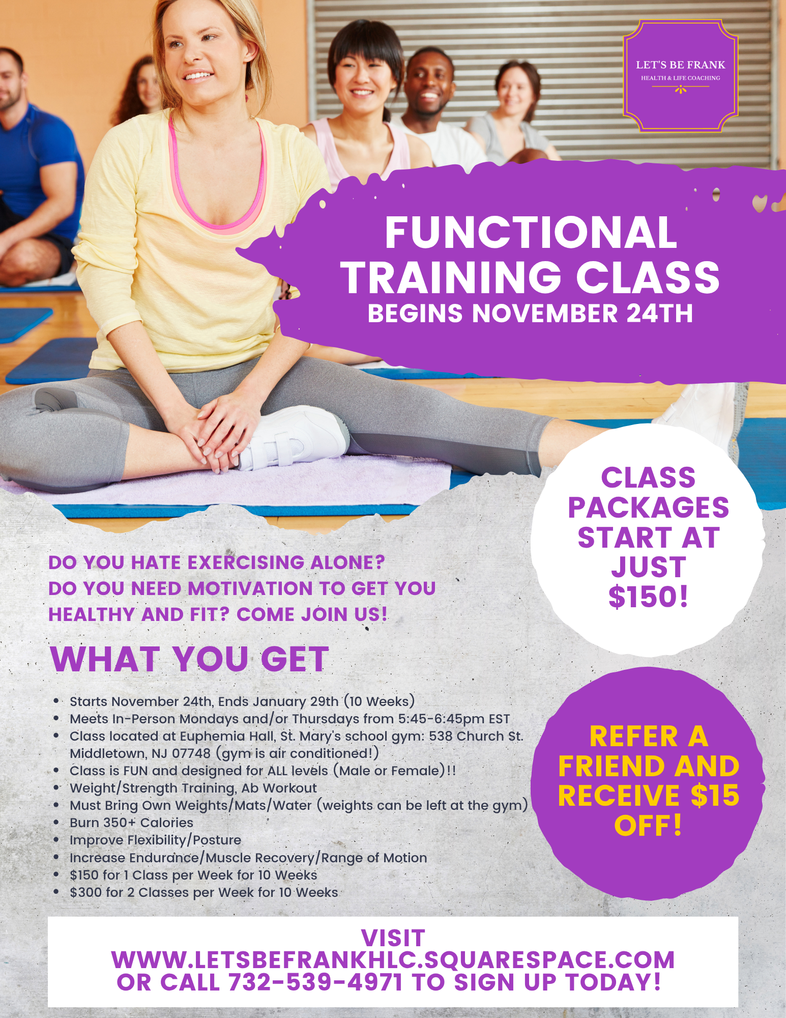 We will be offering our Functional Training Classes in person ONLY, located at Saint Mary’s School (538 Church St. Middletown, NJ O7748) on both Mondays and Thursdays from 5:45pm - 6:45pm!